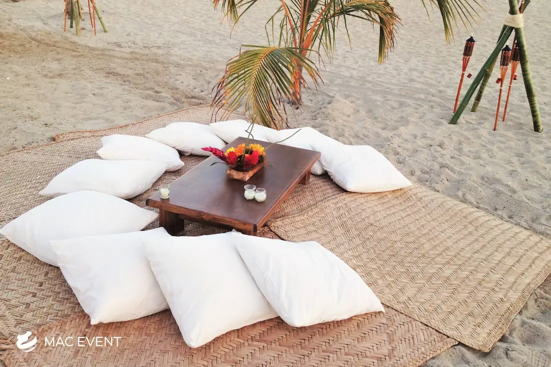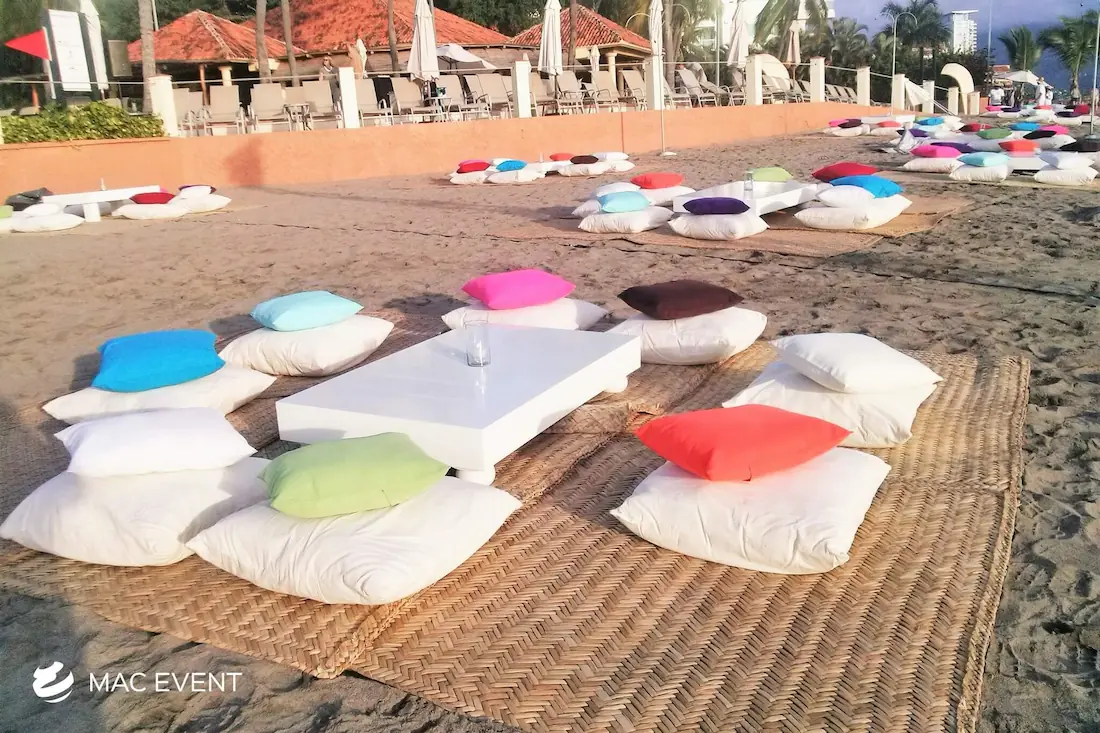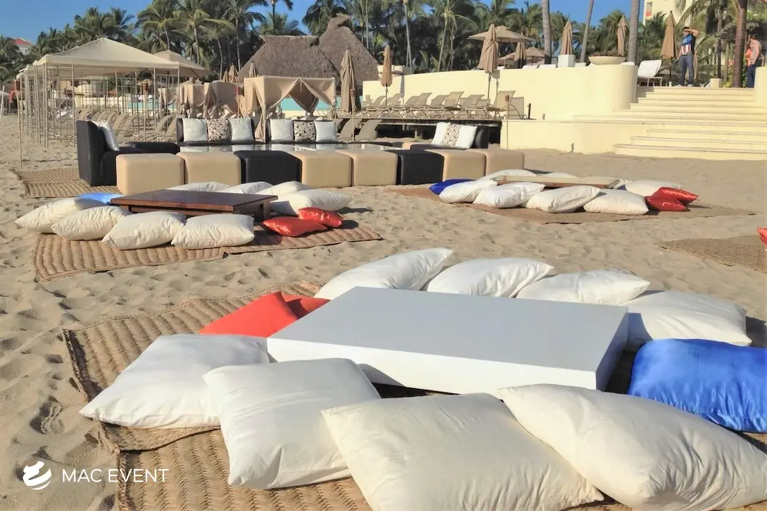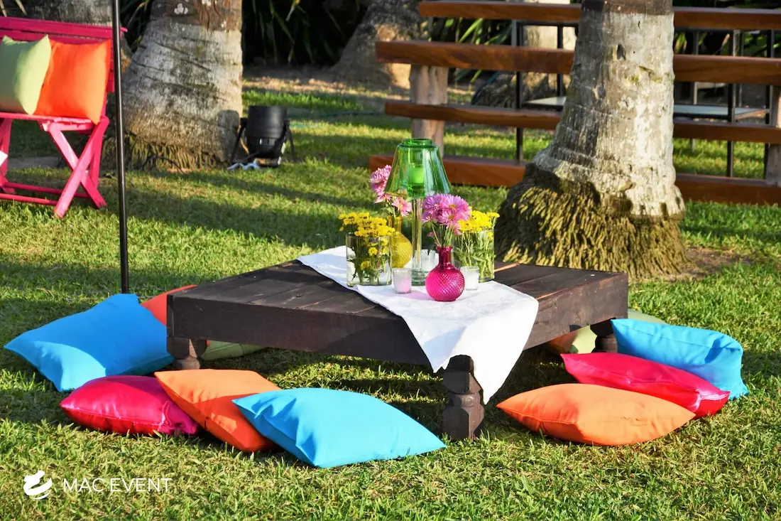 Create a relaxed and casual seating area with our picnic lounges, perfect for weddings and events in Riviera Nayarit. These lounges provide a charming and comfortable seating option, ideal for outdoor events.